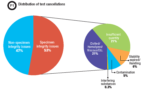 A post-intervention data review demonstrated that approximately 50% of our test cancellations were due to specimen integrity issues such as insufficient quantity for testing, hemolysis, or detection of an interfering substance (Figure 1). With the new cancellation comment, we identified that approximately 10% of these specimens were cancelled due to contamination. This translates to a total of 5% of all test cancellation in our lab for which the enhanced procedure improved communication and documentation, approximately 1,500 specimens a year.