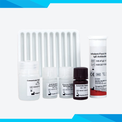 The Inhalant-Food Allergen-specific IgE Antibodies Test Kit is used for qualitative detection of allergen specific IgE in human serum. (Detection Range: 0.35-100 IU/mL) (Sample Volume: 400 μL)